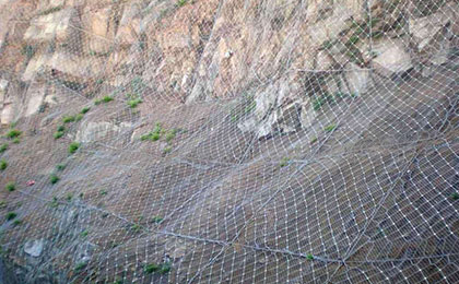 鋪網(wǎng)、釘網(wǎng)采用高鍍鋅棱形鐵絲網(wǎng)或高強(qiáng)塑料加強(qiáng)土工網(wǎng),網(wǎng)孔規(guī)格為5cm×5cm.巖石處用風(fēng)鉆或電鉆按1×1m間距梅花形布置錨桿和錨釘。錨桿長90-100cm.錨釘長約15-40cm.掛網(wǎng)施工時采用自上而下放卷,相鄰兩卷鐵絲網(wǎng)(土工網(wǎng))分別用綁扎鐵絲連接固定,兩網(wǎng)交接處至少要求有10cm的重疊,錨釘每平方米不少于5只。網(wǎng)與作業(yè)面保持一定間隙,并均勻一致。